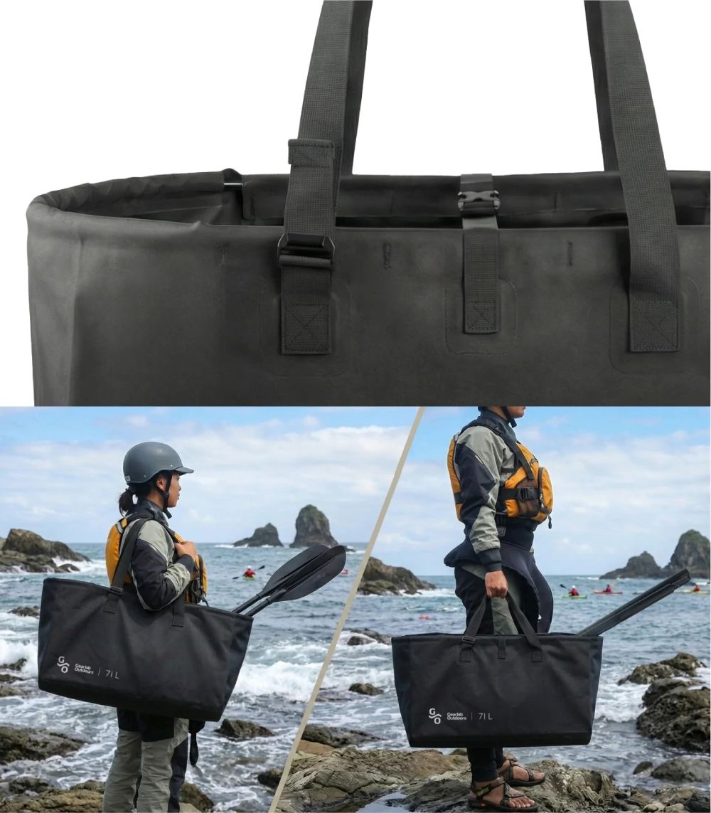 Der Gearlab Gear Tub ist die Lösung für den Transport nasser Paddel- und/oder Outdoorausrüstung. Die großzügige 71 Liter große Tasche garantiert durch die getapten Nähte sowohl einen trockenen Kofferraum, als auch die Möglichkeit versalzene, dreckige Ausrüstung in der Wanne einzuweichen und zu spülen. Ein Multitalent, das die obligatorischen blauen Tragetaschen in der Paddlerwelt ablösen kann.