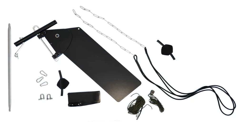 Lieferumfang: 1 Steuerblatt, 1 Steuerbalken, 2 Schekel für Steuerbalken, 2 Steuerleinen im Bowdenzug, 2 Verlängerungsketten für die Steuerleinen, 2 elastischen Schlaufen (Abspannung für die Steuerleinen), 1 Aufholleine, 1 Steueraufholelement, 5 Karabiner